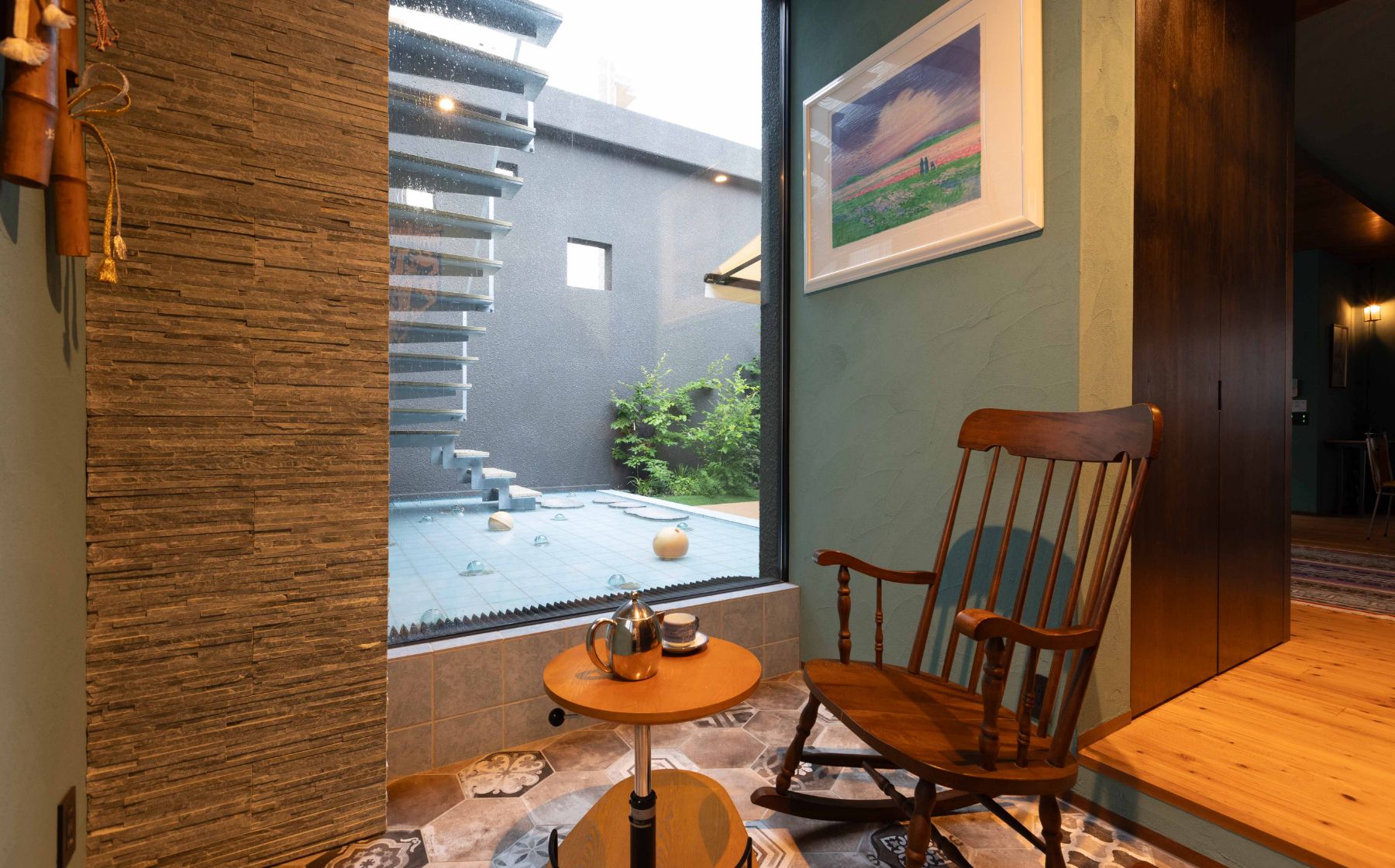 滝と緑が眺められるアートな世界。
